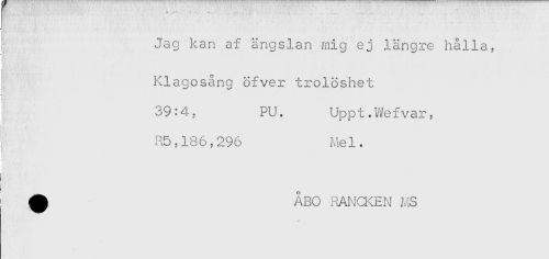 //// ** '"* //// Jag kan af ängslan mig ej längre hålla, //// ! - //// .... .,. . //// Klagosång öfver trolöshet //// 39:4, PU. Uppt.Wefvar, //// R5,186,296 Mel. //// - //// ; ^ ÅBO RANCKEN AiS ////