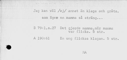 //// ^ . //// Jag kan väl /ej/ annat än klaga och gråta, //// som ägeD en mamma så sträng... //// i //// ! //// 1 //// i //// B 79^1,s.27 Det gjorde mamma,när mamma //// var flicka. 5 str. //// ] ' ' . //// A 190:61 En ung flickas klagan. 5 str. //// RA ////
