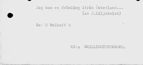 //// fl ^ //// Jag kom en främling ifrån Osterland... //// ^^ (av J.Liljekvist) //// Se: O Wolkoff b //// KB:s SKILLINGIRYCKSREG. //// j //// ! ////