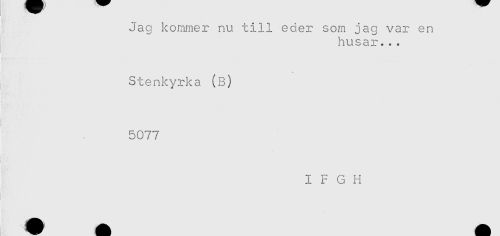 //// Jag kommer nu till eder som jag var en //// husar... //// Stenkyrka (B) //// 5077 //// I F G H ////