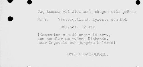 //// Jag kommer väl åter me'n skogen står groner //// Nr 9. Vestergötland. Lyresta s:n,Dbk //// Mel.not. 2 str. //// (Kommentaren s.49 anger 16 str., //// som handlar om tvänne älskande, //// herr Ingevald och jungfru Malfred) //// DYBECK SV§FOLKMEL. ////