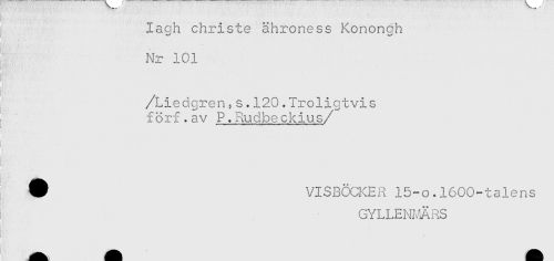 //// ! .... //// laoh christe ähroness Konongh //// Nr 101 //// . /Liedgren $ s.120.Troligtvis //// -forf.av P. Rudbeckius/ //// ! //// # VISBÖCKER 15-o.l600-talens //// GYLLENMÄRS ////