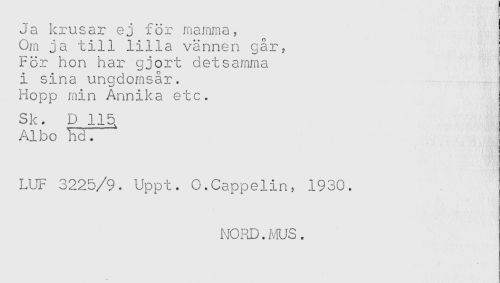 //// Ja krusar ej för mamma, //// Om ja till lilla vännen gar. //// För hon har gjort detsamma //// i sina ungdomsår. //// Hopp min Annika etc. //// Sk. D 115, //// Al bo W. //// LUF 3225/9. Uppt. O.Cappelin, 1930. //// NORD.MUS. ////