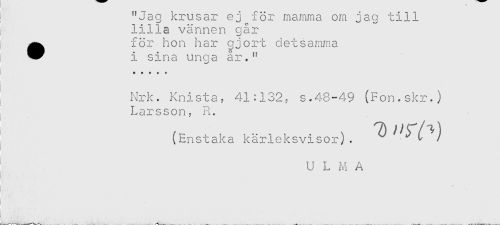 //// I "Jag krusar ej i or mamma om jag till //// i lilla vännen går //// i ^ för hon har gjort detsamma //// ] * i sina unga år." //// ' Nrk. Knista, 41:132, s.48-49 (Fon.skr.) //// . Larsson, R. //// (Enstaka kärleksvisor) . ^ ^^ ^^ //// U L A //// ! . . . ////
