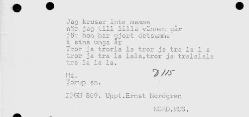 //// * ^ ^ //// # //// Jag krusar inte mamma //// när jag till lilla vännen går //// för hon har gjort detsamma //// i sina unga ar //// Tror ja trorla la tror ja tra la 1 a //// tror ja tra la lala,tror ja tralalala //// tra la la la. //// Ha. 3/xr //// Torup sn. //// IFGH 869. Uppt.Ernst Nordgren //// NOPD.MUS. ////