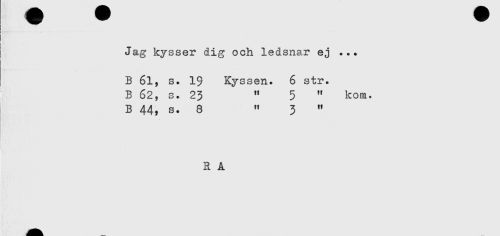 //// Jag kysser dig och ledsnar ej ... //// B 61, s. 1$ Kyssen. 6 str. //// B 62, s. 23 " 5 " kom. //// B 44, s. 8 " 3 " //// R A ////