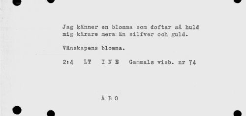 //// Jag känner en blomma som doftar så huld //// mig kärare mera än silfver och guld. //// Vänskapens blomma. //// 2:4 LT I N E Gammals visb. nr 74 ////