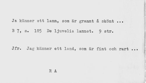 //// Ja känner ett lann, som är grannt å skönt ... //// B s. 185 De ljuvelia lannet. $ str. //// Jfr. Jag känner ett land, som är fint och rart ... j //// R A ////