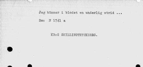 //// Jag känner i blodet en underlig strid ... //// Se: N 1741 a //// t //// KB:S SKILLINGTRYCKSREG. //// ) ////