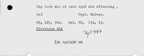 //// ^ ^^ Jag lade mig så sent uppå min aftonsäng , //// ; 9:2 Uppt. Wefvar. //// R3, 165, 282. Mel. R6, 194^ 13- //// Kärestans död , / //// - //// ÅBO RANCKEN MS //// _____ r ____ _ ____ ////