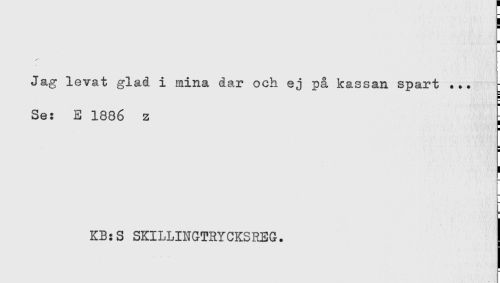 //// H //// H //// Jag levat glad i mina dar och ej på kassan spart ... //// H //// H //// Se: E 1886 z //// H //// 5 //// H //// ) //// KB:S SKILLINGTRYCKSREG. ////