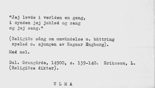 //// "Jej levde i verlden en gäng, //// i synden jej jubled og sang //// og jej sang." //// - //// (Religiös sång om omvändelse o. bättring //// spelad o. sjungen av Ragnar Engborg). //// Med mel. //// ' t ^ "- ' //// Dal. Grangärde, 14900, s. 139-140. Eriksson, L. //// (Religiösa dikter). //// U L M A ////