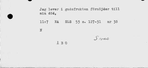 //// ! Jag lever i gudsfruktan fornöjder till //// ^ min död, //// 11:7 NA SLS 53 s. 127-31 nr 38 //// J //// ! N //// ÅBO ////