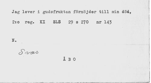 //// Jag lever i gudsfruktan förnöjder till min död, //// 2:o reg. Kl SLS 29 s 270 nr 143 //// N. //// ÅBO ////