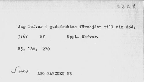 //// Jag lefver i gudsfruktan förnöjder till min död, //// 3:6? NV Uppt. Wefvar. //// R5, 186, 270 //// - //// ^ ^^ ÅBO RÅNCKEN HS ////