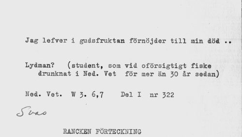 //// Jag lefver i gudsfruktan förnöjder till min död .. //// Lydman? (student, som vid oförsigtigt fiske //// drunknat i Ned. Vet för mer än 30 år sedan) //// Ned. Vet. W 3. 6,7 Del I nr 322 //// RANCKEN FÖRTECKNING ////
