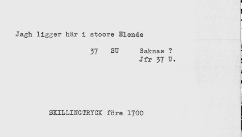 //// Jagh ligger här i stoore Elende //// 37 SU Saknas ? ' //// Jfr 37 U. //// r //// SKILLINGTRYCK före 1700 ////