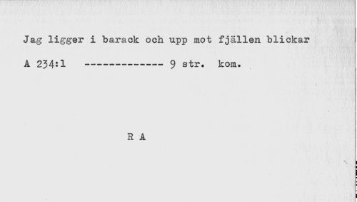 //// Jag ligger i barack och upp mot fjällen blickar //// A 234:1 -------— 9 str. kom. //// t //// i //// j //// R A ////