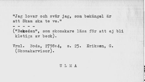 //// "Jag lovar och svär jag, som bekängel är //// att Skam ska te ve." //// ("Bekeden", som skomakare läsa för att ej bli //// kletiga av beck). //// Vrml. Boda, 2798:4, s. 25* Eriksen, G. //// (Skomakarvisor). //// U L M A ^ //// g //// H //// 5 ////