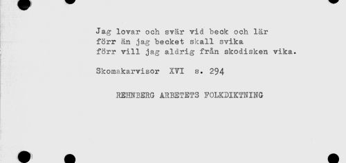 //// Jag lovar och svär viå beck och lär //// förr än jag becket skall svika //// förr vill jag aldrig från skodisken vika. //// Skomakarvisor XVI s. 294 //// REHNBERG ARBETETS FOLKDIKTNING ////