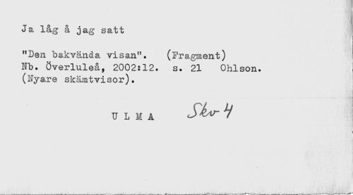 //// Ja låg å jag satt //// "Den bakvända visan". (Fragment) //// Nb. Överluleå, 2002:12. s. 21 Ohlson. //// (Nyare skämtvisor). //// ** //// ULMA //// ; t //// * ' ' ,' ] ////