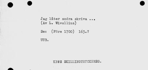 //// Jag låter andra skriva ... //// (Av L. Wivallius) //// Se: (Före 1700) I63.? //// UUB. //// KB?S SKILLINGTRYCKSREG. ////