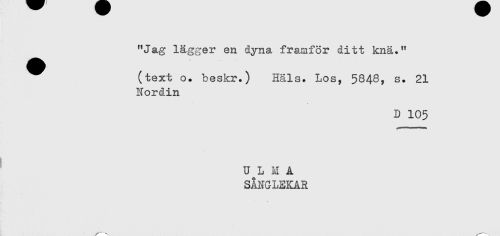 //// "Jag lägger en dyna framför ditt knä." //// (text o. beskr.) Hals. Los, 5848, s. 21 //// Nordin //// D 105 //// r- " -- //// U L M A //// SÅNGLEKAR //// ---. ////