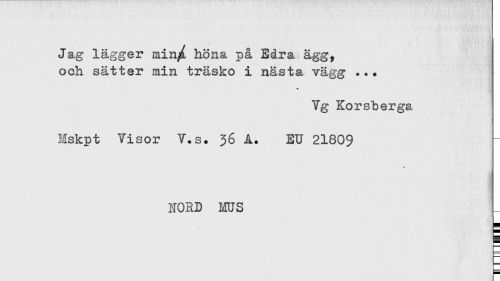 //// Jag lägger min^ höna på Edra ägg, //// och sätter min träsko i nästa vägg ... //// Vg Korsberga //// Mskpt Visor V.s. 36 A. EU 21809 //// t //// NORD MUS ////