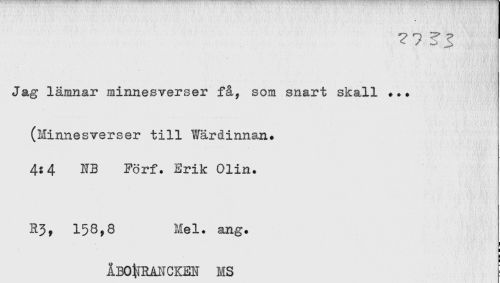 //// ?? //// Jag lämnar minnesverser få, som snart skall ... //// (Minnesverser till Wärdinnan. //// 4:4 NB Förf. Erik Olin. //// R3, 158,8 Mel. ang. //// ÅBO^RANCKEN MS ////