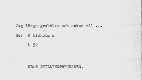 //// Jag länge grubblat och saken tål ... //// Se: F Lidholm m //// L 52 //// KB:S SKILLINGTRYCKSREG. ////