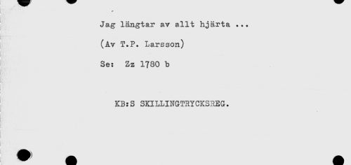 //// Jag längtar av allt hjärta ... //// (Av T.P. Larsson) //// Se: Zz 1780 b //// i ' //// KB:S SKILLINGTRYCKSREG. //// . ' ' ' //// ' f.'< - ////
