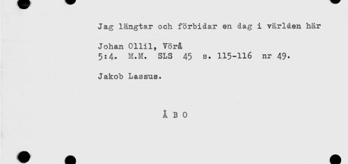 //// Jag längtar och förbidar en dag i världen här //// Johan Ollil, Vörå //// 5:4. M.n. SLS 45 s. 115-116 nr 49- //// Jakob Lassus. //// ÅBO ////