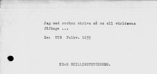 //// ! Jag med suckan skriva må om all världeens //// fåfänge ... //// Se: UUB Folkv. 1635 //// { ' ' * //// H-H H ! //// KB:S SKILLINGTRYCKSREG. ////