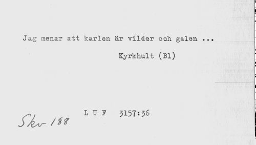 //// i //// * //// 5 //// Jag menar att karlen är vilder och galen ... //// Kyrkhult (Bl) //// i //// < //// H //// ! //// ^ L U F 3157:36 ////