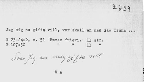 //// Jag mig nu gifta vill, var skall en man jag finna ... //// B 23-24:2, s. 51 Emmas frieri. 11 str. //// B 107:50 " " 11 " //// R A ! ////