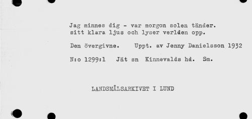 //// Jag minnes dig - var morgon solen tänder, //// sitt klara ljus och lyser verlden opp. //// Den övergivne. Uppt. av Jenny Danielsson 1932 //// N:o 1299:1 Jät sn Kinnevalds hd. Sm. //// LANDSMÅLSARKIVET I LUND ////