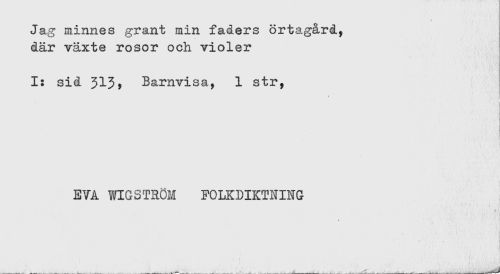 //// Jag minnes grant min faders örtagård, //// där växte rosor och violer //// 1: sid 313? Barnvisa, 1 str, //// t //// i //// EVA WIGSTROM FOLKDIKTNING //// - ////