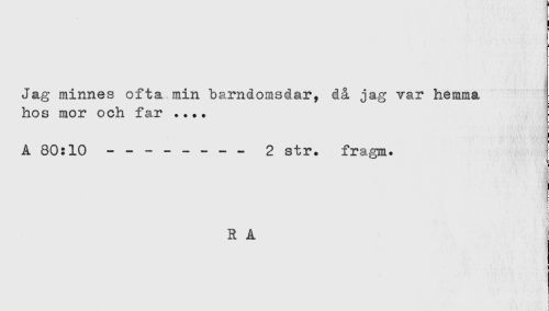 //// Jag minnes ofta min barndomsdar, då jag var hemma //// hos mor och far .... //// A 80:10 - -- -----2 str. fragm. //// t //// i //// t //// i //// R A //// c ////