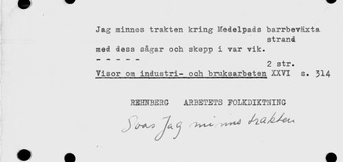 //// Jag minnes trakten kring Medelpads barrbeväxta //// strand //// med dess sågar och skepp i var vik. //// 2 str. //// Visor om industri- och bruksarbeten XXVI s. 314 //// REHNBERG ARBETETS FOLKDIKTNING ////