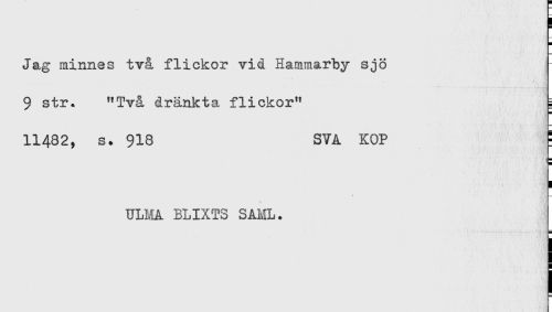 //// H //// H //// Jag minnes två flickor vid Hammarby sjö //// 9 str. "Två dränkta flickor" ^ //// 11482, s. 918 SVA KOP ! //// < //// ULMA BLIXTS SAHL. //// i ////