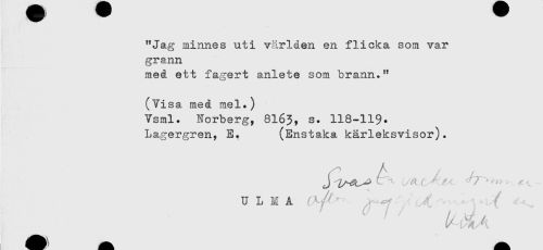 //// "Jag minnes uti världen en flicka som var //// grann //// med ett fagert anlete som brann." //// (Visa med mel.) //// Vsml. Norberg, 8I63, s. 118-119* //// Lagergren, E. (Enstaka kärleksvisor). //// U L E A ,- ^ ' ////