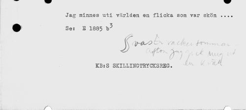 //// Jag minnes uti världen en flicka som var skön .... //// ^ Se: E 1885 //// KB:S SKILLINGTRYCKSREG. ////