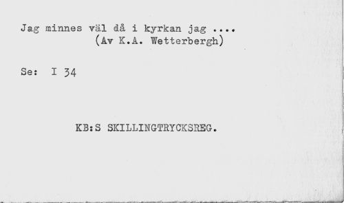 //// Jag minnes väl då i kyrkan jag .... //// (Av K.A. Wetterbergh) //// Se: I 34 //// KB:S SKILLINGTRYCKSREG. //// i //// ' i ////