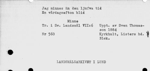 //// Jag minnes än den ljufva tid //// En vårdagsafton blid - //// < ' ' ' . * //// !'.' tf ' . //// Minne //// Tr. i Sv. Landsmål VII:6 Uppt. av Sven Thomas- //// son 1884 //// Nr 560 Kyrkhult, Listers hd. I //// Blek. //// * //// * //// LANDS!dÅLSARKIYET I LUND ////