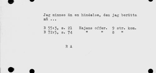 //// Jag minnes än en händelse, den jag berätta //// må ... //// B 55:3? s. 21 Hajens offer. $ str. kom. //// B 72:5? s. 74 " " 8 " //// R A ////