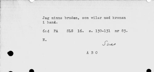 //// T- //// ! //// - //// y . . . //// < //// Jag minns bruden, som vilar med kronan //// i hand. //// 6:4 PA SLS 16. s. 130-131 nr 83. //// r //// J ////