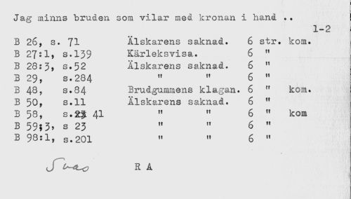 //// Jag minns bruden som vilar med kronan i hand . . //// 1-2 //// B 26, s. 71 Älskarens saknad. 6 str. kom. //// B 27:1, s.139 Kärleksvisa. 6 " //// B 28:3, s.52 Älskarens saknad. 6 " //// B 29, s.284 " " 6 " //// B 43? s.84 Brudgummens klagan. 6 " kom. //// B 50, s.ll Älskarens saknad. 6 " //// B 58, s.2^ 41 " " 6 " kom //// B 59;3* s 23 " " 6 " //// B 98:1, s.201 " " 6 " //// J R A ////