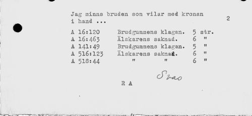 //// Jag minns bruden som vilar med kronan //// 2 //// i hand ... //// ^^ A 16:120 Brudgummens klagan. 5 str. //// A 16:463 Älskarens saknad. 6 " //// A 141:49 Brudgummens klagan. 5 " //// A 516:123 Älskarens saknaå. 6 " //// A 518:44 " " 6 " //// R A ////