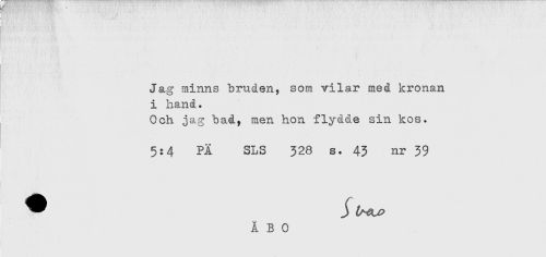 //// Jag minns bruden, som vilar med kronan //// i hand. //// Och jag bad, men hon flydde sin kos. //// 5:4 PÄ SLS 328 s. 43 nr 39 ////