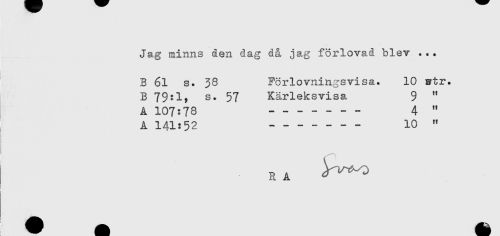//// Ja,g minns den dag då jag förlovad blev . . . //// B 61 s. 38 Förlovningsvisa. 10 artr. //// B 79:1, s. 57 Kärleksvisa 9 " //// A 107:78 ----4 " //// A 141:52 ----10 " //// RA ////